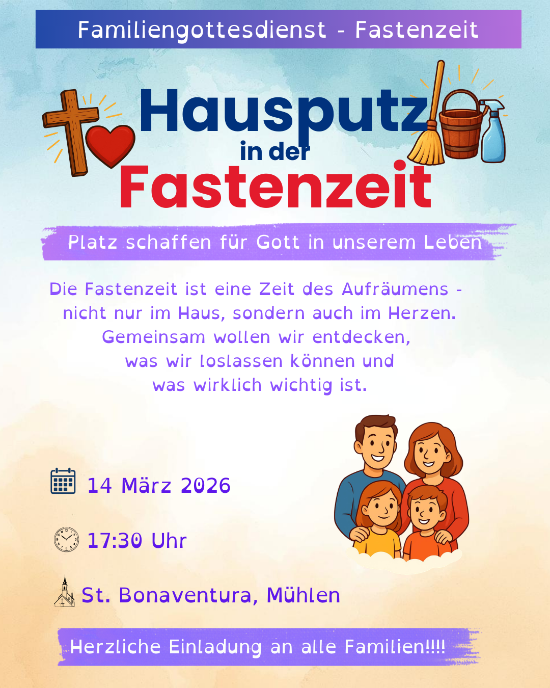 „Platz schaffen für Gott in unserem Leben!“ Die Fastenzeit ist Zeit des Aufraumen – nicht nur im Haus, sondern im Herzen. Wir lassen los, was uns belastet, und entdecken, was wirklich wichtig ist. Herzliche Einladung an alle Familien! Kommt und feiert mit.